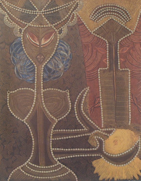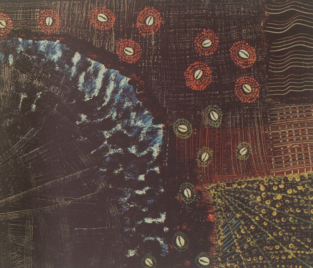 During this period, Seye became renowned for her distinctive use of cowrie shells. Once used as currency in Africa, cowries convey symbolic spiritual and material power. Across the continent, cowries are also associated with fertility, women’s adornment, and feminine power. Seye was among the earliest artists to employ them as a material, threading them onto canvas or embedding them into marble or iron, and she believed that “the language of the spirits is passed down through the secret of cowries.”3Noël Ebony, “Première artiste-peintre africaine, Younousse Seye: ‘Le langage des genies se transmet dans le secret des cauris,’” Fraternité-Matin, July 11, 1972. Through her signature use of the shell, Seye merged African spirituality, feminine symbolism, and continental themes of power and ritual in her work, creating a unique expression of Pan-African feminism. Her engagement with Pan-African themes quickly earned her the attention and patronage of President Léopold Sédar Senghor, who helped to propel her career from the early 1970s onward.4In 1969, the minister of culture officially invited Seye to debut with Senegal’s delegation at the Pan-African Cultural Festival in Algiers. There, she won a UNESCO residency, which she chose to spend in Côte d’Ivoire rather than Europe, deepening her exploration of cowries. Her first solo exhibition upon her return to Dakar in 1971 earned her critical praise. For more on Seye’s trajectory, including her participation in the 1969 Algiers festival, see Merve Fejzula, “Younousse Seye,” AWARE: Archives of Women Artists, Research & Exhibitions, 2023, https://awarewomenartists.com/en/artiste/younousse-seye/; and Judith Rottenburg, “Younousse Seye: The Making of a Pan-African Woman Artist in Post-Independence Senegal,” AWARE, December 15, 2018, https://awarewomenartists.com/en/magazine/younousse-seye-le-devenir-dune-artiste-panafricaine-dans-le-senegal-de-lapres-independance/.