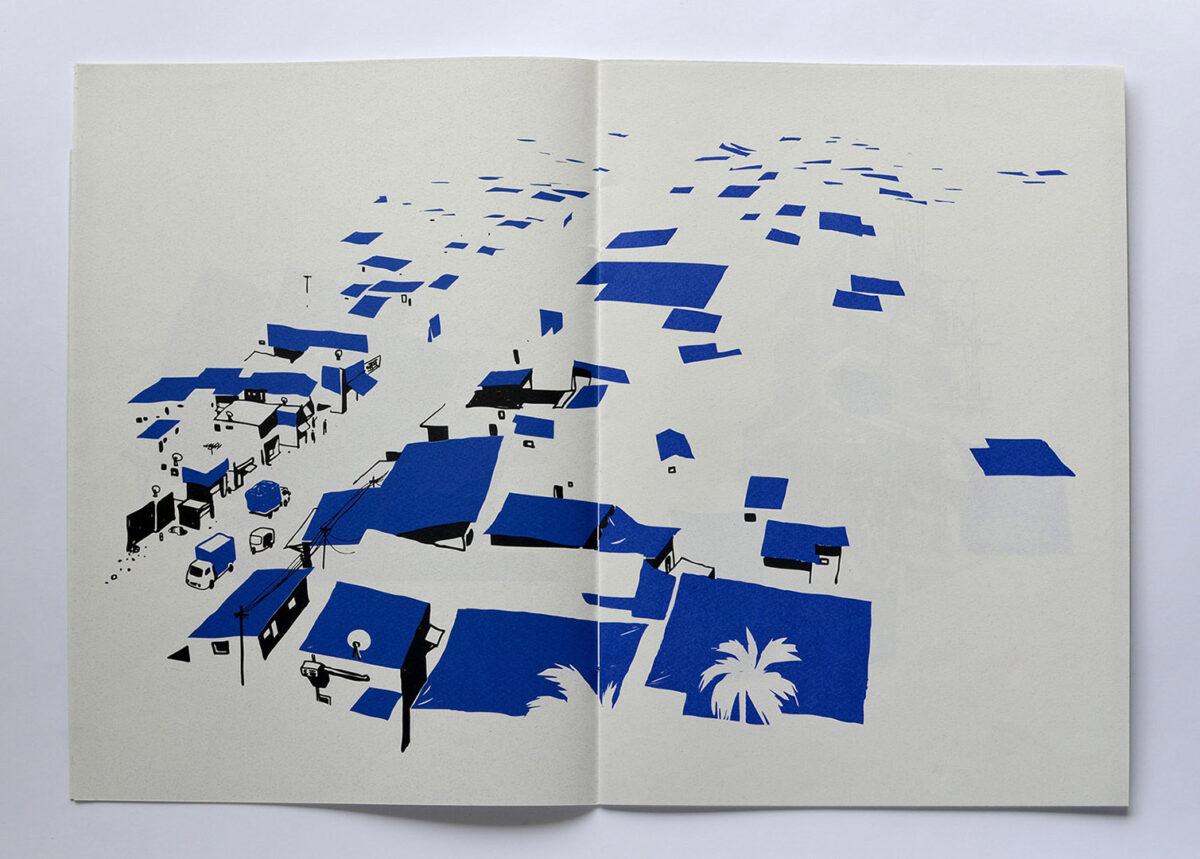ZK: We’re simply trying to make sense of the country and the city in our own way, and that comes out in the form of zines, artworks, and murals. Take the blue tarpaulin sheet, or tadpatri as we call it locally, for example.