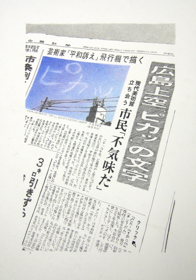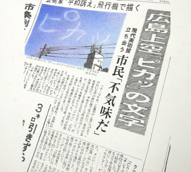 Writing the word “PIKA!” in a vapor trail over the Atomic Bomb Dome in Hiroshima, this work inscribed a mimetic word reminiscent of a panel from a comic book in the scenery of Hiroshima. The disappearing vapor trail meshes with the decay of memories as an expression of contemporary understanding of peace in postwar Japan.