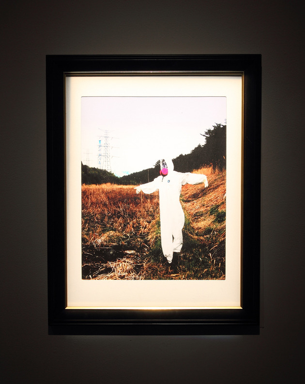 Chim↑Pom installed a scarecrow wearing a protective suit and a gas mask on an abandoned farm close to the Fukushima Daiichi Nuclear Power Station. The work is a homage to evacuated locals and workers at the nuclear power station.