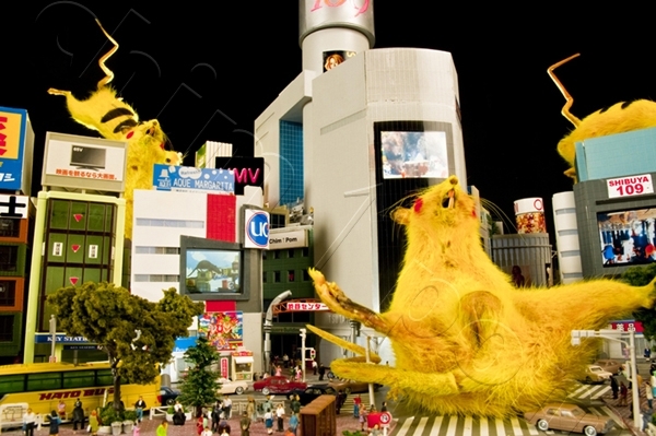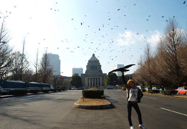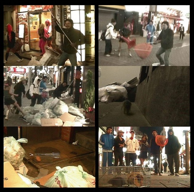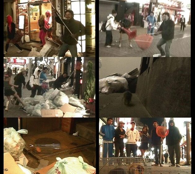 These videos and photos show Chim↑Pom herding ever-proliferating crows over Tokyo’s landmarks. In order to assemble crows from all quarters, Chim↑Pom walked around in parks with a stuffed crow and a megaphone amplifying the call crows make to summon others. Later, on the road, a car or motorcycle drove beneath the flying crows, increasing their numbers on the way to each destination. Photos taken at Tokyo’s landmarks were later packaged as a Tokyo souvenir postcard set.