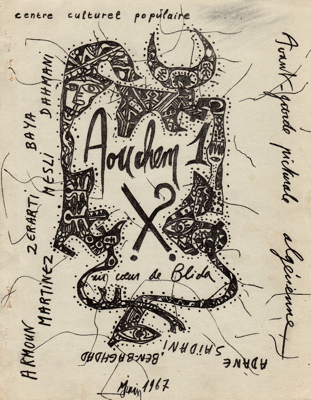 Jean Sénac, acting as a mentor, encouraged the inclusion of other Algerian artists, such as Baya (1931–1998) and Arezki Zerarti (1938–2024). He also played an important role as a mediator between artists and writers, maintaining close ties with members of the group and supporting the circulation of their work through exhibitions, publications, and broadcasts. In Algeria, where figuration could be perceived as either an academic colonial inheritance or propaganda, Aouchem chose abstracted figuration, opting for hybrid and interstitial creatures. Their refusal of both illustrative imagery and pure abstraction became a gesture of emancipation. The covers of the 1967 Aouchem exhibition catalogues (figs. 5, 6) reflect this stance. Both compositions bring together signs, fragmented figures, handwritten elements, and ornamental motifs, which are arranged without a clear hierarchy or focal point. Figurative references appear and dissolve without settling into a stable image or legible scene. Printed with a mimeograph, the catalogues preserve traces of their production: irregular lines, uneven lettering, visible overlaps. These material imperfections distinguish them from institutional graphic formats. The covers do not present a coherent visual statement; instead, they allow disparate marks, images, and gestures to coexist on the page.