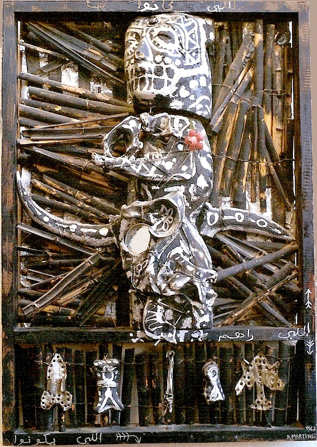 Denis Martinez’s Le petit miroir (1967; fig.7) illustrates how the precepts of the School of the Sign materialized within Aouchem as an expanded artistic practice. The piece is a mixed-media assemblage made of three branches, animal bones, and paper, among other materials, and stands somewhere between an image and a sculpture. Across the surface, there are silver, calligraphy-like motifs—dots, geometric patterns, short gestural arabesques, and words drawn from Algerian dialect—that are placed on fractured planes and roughly human-shaped forms. These Signs do not organize themselves into writing; indeed, they remain dispersed, uneven, and materially present. The combination of painted wood and raised forms gives the Sign a totemic presence, grounding it in artisanal practice. Here, it is no longer conceived as a system of visual forms to be read, but rather as a physical presence embedded in the object itself. Freed from its function as writing and reconfigured as an element of the assemblage, the Sign emerges through matter and volume, extending its logic beyond the pictorial field into a material and experiential register.