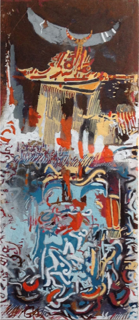 The School of the Sign was not devoid of internal frictions—notably, artists debated the very definition of popular art. The tensions ranged, on the one hand, from opposition to approaches that understand popular art as a shared visual heritage to be stabilized and made socially legible to, on the other hand, positions that emphasized abstraction and formal experimentation as a necessary break from inherited and imposed models. Multiple approaches to the Sign coexisted without canceling one another. These divergences became particularly visible in the distinct ways individual artists positioned themselves in relation to abstraction, spirituality, and the use of the letter. Artists such as Abdallah Benanteur (1931–2017) gravitated toward lyrical abstraction infused with an Islamic sensibility.10Jean Sénac, Peintres algériens: Benanteur, Khadda, Martinez, Zerarti (L’Orycte, 1982).