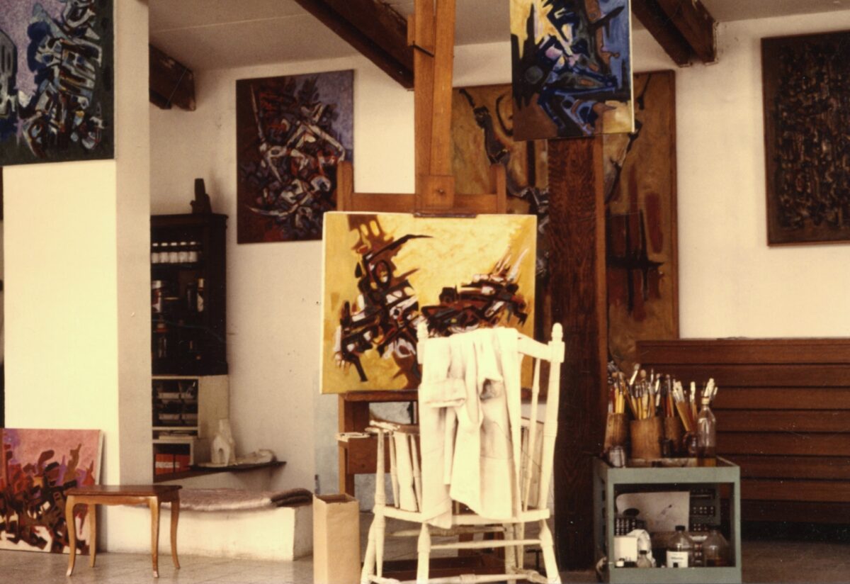 A photograph of Khadda’s atelier (fig. 4) provides a more concrete understanding of this process. This image shows a space filled with canvases at different stages, placed side by side and often overlapping. Signs reappear in one painting after another, shifting in scale and density. Tools and materials remain visible. The studio reflects a practice based on repetition, layering, and gradual transformation, which is consistent with Khadda’s background in typography and his sustained attention to the potentials of the Sign.