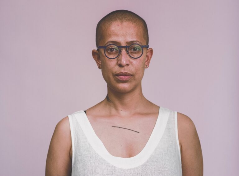 By sustaining a ritual of mourning for more than three decades after Berenice’s death, Berenice 29–39 performs, as Goliath explains, “a certain refusal of ‘the archive’ as a political configuration of differentially valued life.”14Goliath in discussion with the author, November 2025. This refusal is enacted through duration, embodiment, and collaboration. Against systems that render racialized and gendered violence legible only through anonymized data, the series holds a name—“Berenice”—close, repeating it without exhausting it. As sitters enter a photographic archival register, they inhabit it otherwise, transforming seriality into ritual and standardization into a collective labor of care. The life-size portraits (fig.5) confront viewers directly, interrupting the one-directional gaze of administrative photography and recasting spectatorship as an ethical encounter. Attuned to the reverberation of Berenice’s mother’s call, Berenice 29–39 asks what it means to remain with mourning rather than to resolve it. In doing so, the series moves beyond critique to model a way of living with loss that resists closure and forgetfulness, insisting instead on the ongoing grievability of a life the archive failed to hold.