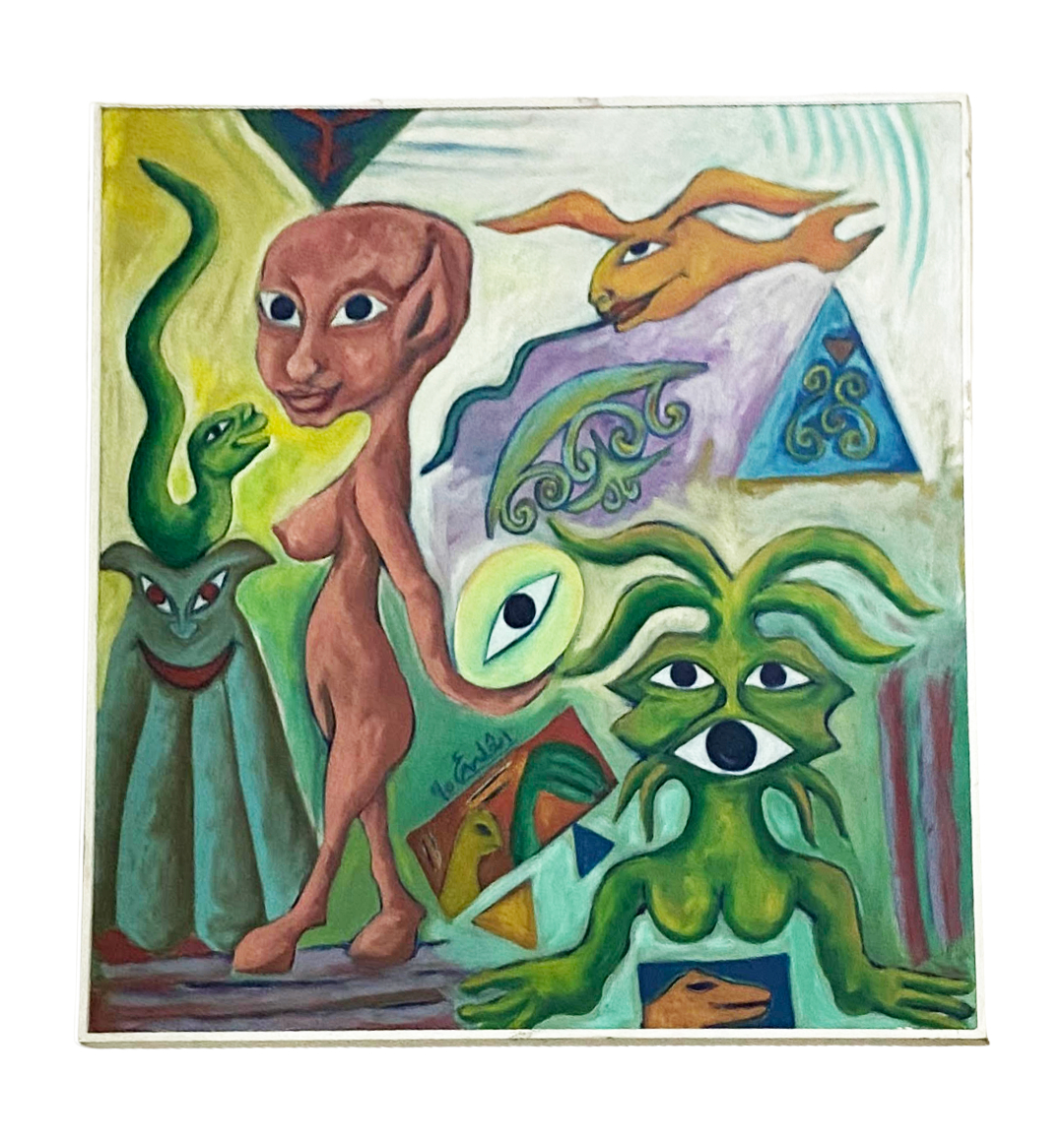 When prodded about the imaginative tropes in her work, Ashamallah sings a song that the village women would sing in a processional held at night during the lunar eclipse. Her artwork, which contains elements from Egyptian folklore and Pharaonic motifs—often hybridized alongside figments of her own imagination—offers novel interpretations of traditional forms. Ashamallah’s apartment is filled with paintings, and one that stands out is Hathour and Her Egg (1995), a large, prominent portrayal in her living room of the Pharaonic goddess Hathour (fig. 1). Ashamallah has been consistently preoccupied with the female figure and feminine prowess, as is evident in her depiction of Hathour, mother of all the Pharaohs and a goddess who represents the sky, motherhood, fertility, beauty, music, and joy. When asked what inspires these figures, she recounted a pivotal discovery: that the female mantis eats her partner by decapitating it after they have mated. Though Ashamallah did not elaborate further, it makes sense that the violence and beauty inherent to the natural process of mantis-mating could have inspired her to depict insect-like creatures as well as women with plants or other creatures inside their bellies. For Ashamallah, the female body is the touchstone of creation, the alpha and omega.3For more on the role of the mantis within the Surrealist tradition, see Ruth Markus, “Surrealism’s Praying Mantis and Castrating Woman,” Woman’s Art Journal 21, no. 1 (2000): 33, https://doi.org/10.2307/1358868.