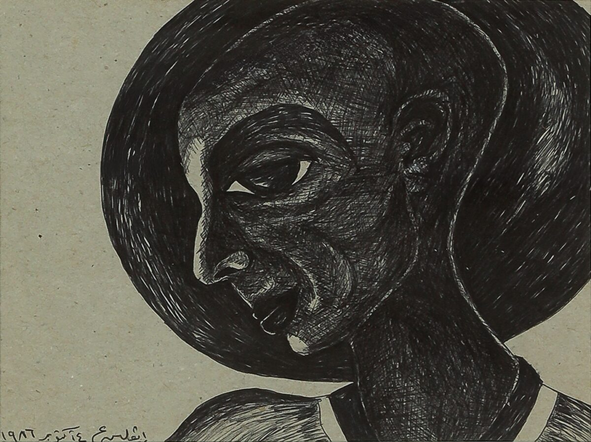 Figure 5. Evelyn Ashamallah. Portrait or Analysis of the features of the Egyptian peasant. 1986. Dry ink on paper, 4 11/16 × 6 11/16″ (12 × 17 cm). Courtesy of Azad Gallery and Evelyn Ashamallah