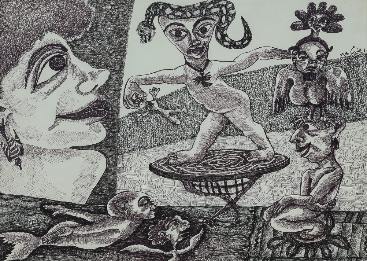 In her 1990 drawing The Peasants’ Hope, Ashamallah employs the signature stacked composition she used in her early Algerian landscapes to completely recast a tired and pernicious rural trope (fig. 6). In the left of the composition, a woman with curly hair and an earring in the form of a striped bird diving downward is rendered in closeup profile above an underworld inhabited by part-sea part-human creatures, who swim toward a twirling structure at the surface. Above it, a central figure is positioned in the typical Pharaonic stance, wherein the feet point in one direction, and the body and head face the viewer. This figure also wears bird-like jewelry as well as a snake on its head. On the right, the artist stacks three figures on top of each other to make one hybrid creature: a crouching man, a bird-woman, and a flower-child. Each figure in this totemic trio relates to a figment from Ashamallah’s memory. Free from the stereotypical tropes that were common in the work of her predecessors, Ashamallah portrays what she knows about Egyptian peasants. Perhaps her renderings are acts of subversion, but it is more likely that they are forms of fantastical futurity, pointing to a time when humans, animals, land, sea, and sky will have all collapsed into an incongruent harmony.