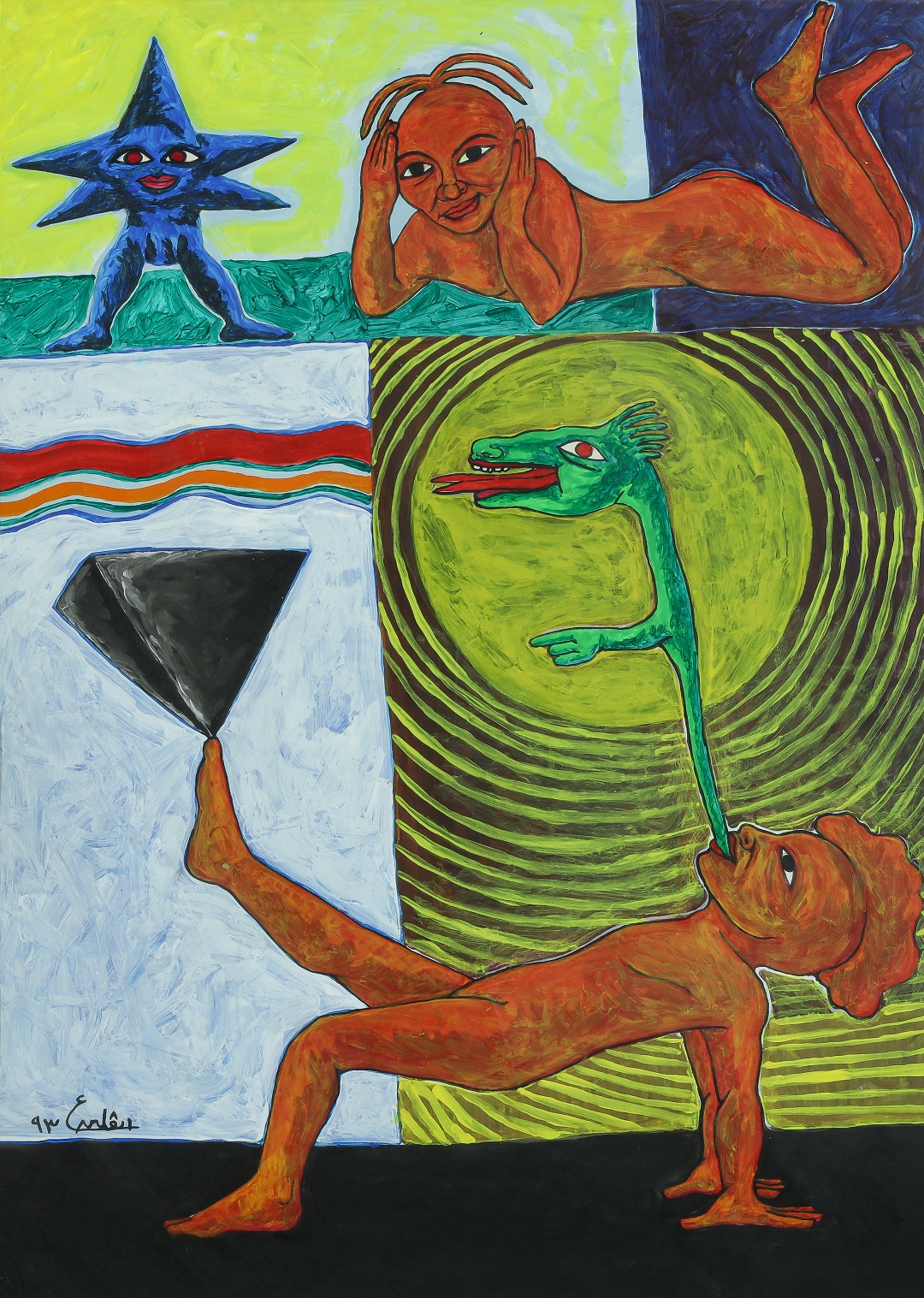 Throughout the 1990s into the early 2000s, Ashamallah dove further into the interspecies realms that had long populated her imagination. In the work from this period, we can begin to identify recurring motifs, including femininity, motherhood, and birth, which are conveyed by pregnant creatures or by characters contained in eggs, and womanhood in the form of reptilian beings with full breasts. These works almost always contain an unbridled articulation of humor and whimsy. As time progressed, Ashamallah depicted her figures with more limbs, tails, and fins, and she portrayed their encounters with even more levity. In her droll renderings, she would imagine conversations between different species that, as she has stated, “are not so easy to understand.” In her painting Balance (1993), we see her signature saturated colors deployed in the portrayal of four figures spilling over four quadrants of a composition (fig. 7). A turnip-headed red boy lies on his stomach and swings his feet next to a blue star creature with red lips, who smiles directly at the viewer. On the bottom of the composition, another red boy balances a reptilian figure in his mouth and an upside-down pyramid on his foot. Like in Ashamallah’s other works, the composition is split and stacked, with each section containing a creature floating in its own respective world, yet brought into conversation with the other creatures in their whimsical portrayal.