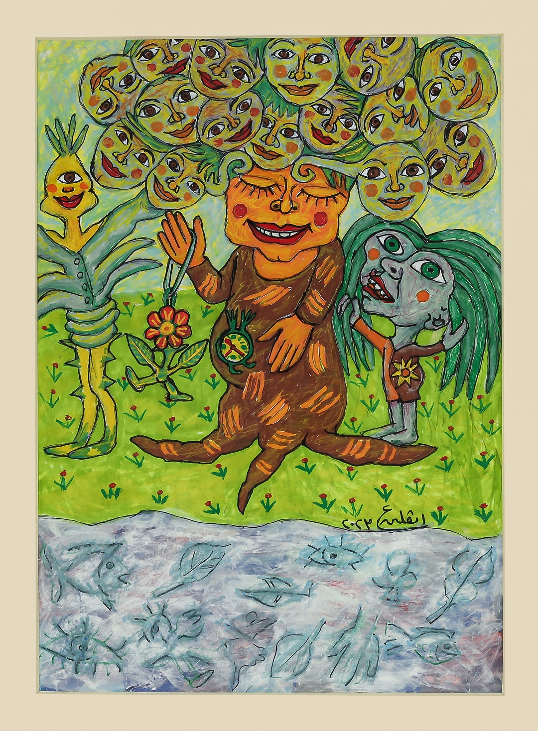 Ashamallah grew up in Desouk, a provincial town in the Egyptian Nile River Delta region of Kafr-el-Sheikh, amid rural traditions that continue to influence her painting and drawing today. Though her Christian family was not originally from this region, they lived in Desouk because her father was assigned there to oversee life insurance policies. At home, her father’s library was rich with literature, which she pored over. Outside, she climbed sycamore trees, befriended the local livestock, and sang folk songs with the neighboring children. She planted rice and other seeds on her aunt’s land, fascinated by watching how plants grow and yield fruits for picking. Today, her imagination is still populated by the creatures, real and invented, that inhabited her early childhood.
