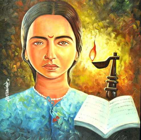 SNS: When I looked at the few visuals that exist of Mukta Salve, there’s really just this one image that circulates. And it doesn’t sit right with me. Beautiful as it is, it feels like it’s coming directly from the lineage of Raja Ravi Varma (1848-1906)—those soft, “divine” upper-caste aesthetics rooted in colonial art pedagogy. Ravi Varma painted women from oppressor-caste households into these ethereal, gentle embodiments of “sacredness,” and those images went on to define what an “ideal Indian woman” or “goddess” looked like (fig. 4). That visual language wasn’t built from our lives; it was built from theirs.