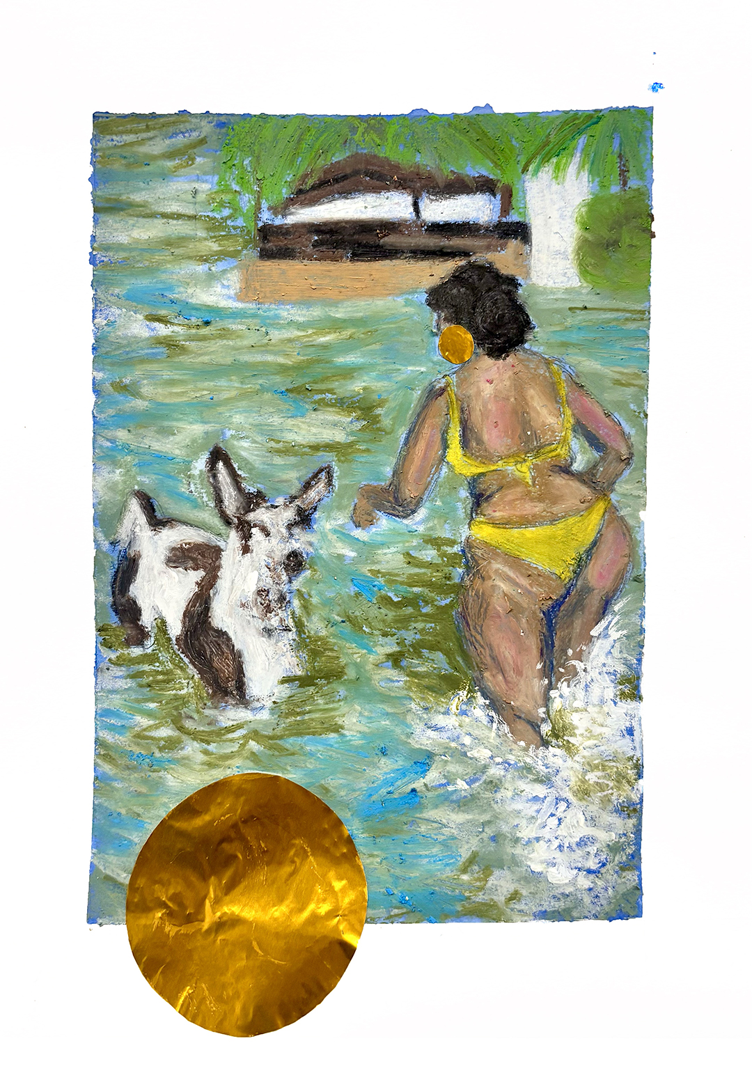 She’s very young. And right now, she’s in this moment of “I’ll do whatever I want. I’m going to have fun. I don’t care what anyone says.” And that takes a long time to arrive at. It might look like normal “young person behavior,” but for her it’s new. She has become young now. That also happened to me—I came into my youth when I was older. When I was younger, I wasn’t young. So for her, this portrait is about exercising agency, claiming the right to live her life as a young person, on her own terms. And for me, it’s also the first time I’m painting someone in this context.