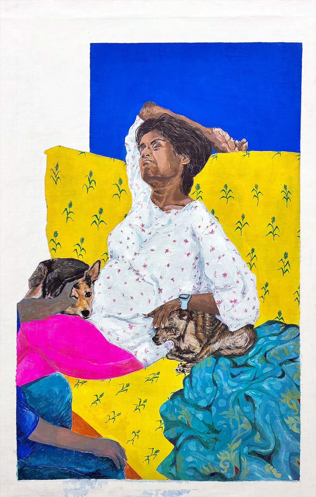 The patterns in the painting do specific work too. The couch pattern comes from the crops grown on Divya’s family’s land. They are literally what she rests on, generationally and materially. The blanket is the exact sari her mother wears in a photo Divya showed me. Divya doesn’t like keeping direct references to her home because the distance becomes too painful, so I brought her mother in indirectly, through pattern. Because her mother is central to Divya’s rest.