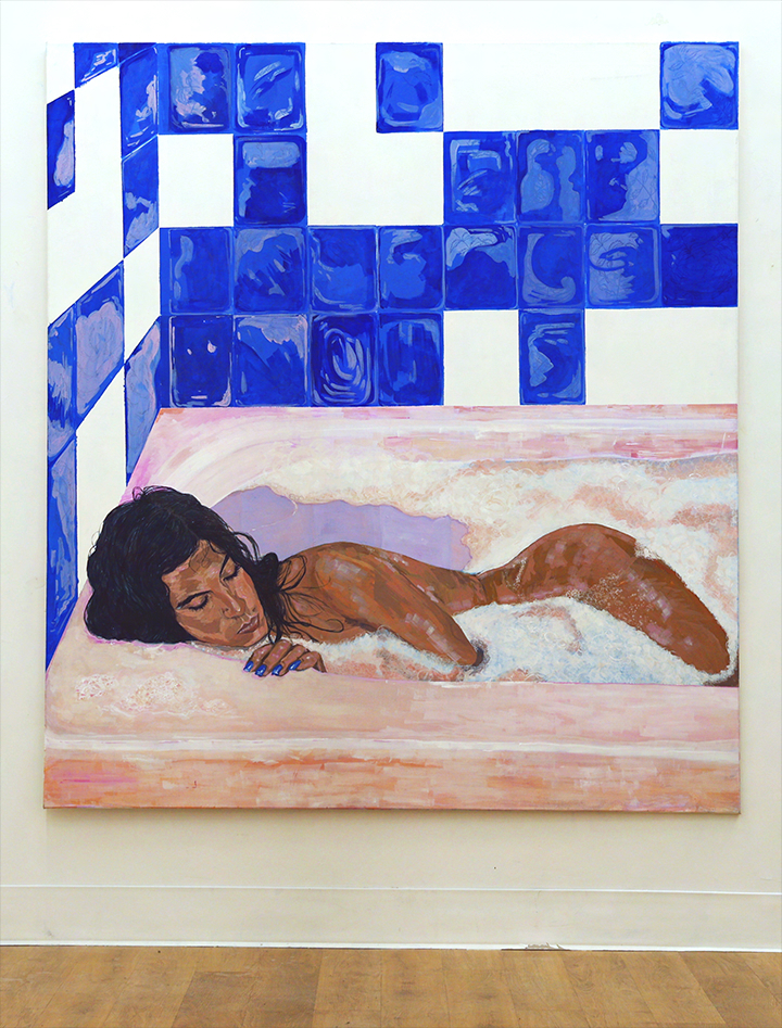 MV: When I visited your studio, you were also working on a portrait of a woman in a bathtub. It felt like a very different kind of scene—still intimate, but coming from another set of questions. Could you talk about what you’re exploring there?