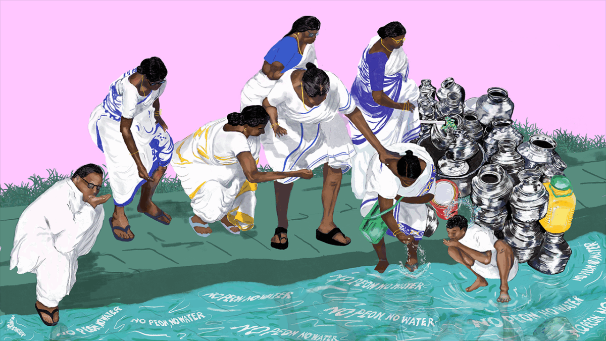 And it continues. There was a case recently of a boy who drank from his principal’s bottle and was beaten. There was Indra Meghwal, a little child in Rajasthan who drank from the common source in school and was beaten to death by his teacher.6In August 2022, Indra Meghwal, a nine-year-old Dalit student in Jalore district, Rajasthan, was assaulted by his teacher after drinking water from a pot reportedly reserved for upper-caste staff. Meghwal later died from his injuries. The incident was widely reported as a case of caste-based violence rooted in everyday practices of segregation around access to drinking water in schools, prompting protests and renewed discussion of the persistence of caste discrimination within state institutions. See Esha Roy, “Dalit boy dies after being assaulted by teacher for touching water pot, Rajasthan,” The Indian Express, August 15, 2022. I was thinking about the violence that water holds, of water as an archive. I was also thinking about Ambedkar’s experiences in school—No peon, no water—where he could only drink if a school official (peon) poured water for him from a height, and if that person didn’t come, he had no water. Water is the site of humiliation and the site of resistance. After Dr. B. R. Ambedkar’s legendary Mahad Satyagraha in March 1927 at Chavdar Tank, the local caste Hindus were infuriated and decided to “purify” the water using panchgavya (a mixture of cow urine, cow dung, milk, ghee, and curd). Polluting the water in this way was preferred to the mere thought of human beings from a different caste touching it.7In 1927 in Mahad, Maharashtra, Dalits led by B. R. Ambedkar drew water from the Chavdar Tank, a public water source from which they had long been excluded despite its legal status. The event, known as the Mahad Satyagraha, marked a landmark challenge to caste discrimination in everyday civic life. An infuriated Dr. Ambedkar decided to burn the Manusmriti shortly after, on December 25, 1927, at Mahad.8The Manusmriti is a classical Hindu legal text that codifies social hierarchy, including caste and gender norms, and has historically been used to justify caste-based exclusion.