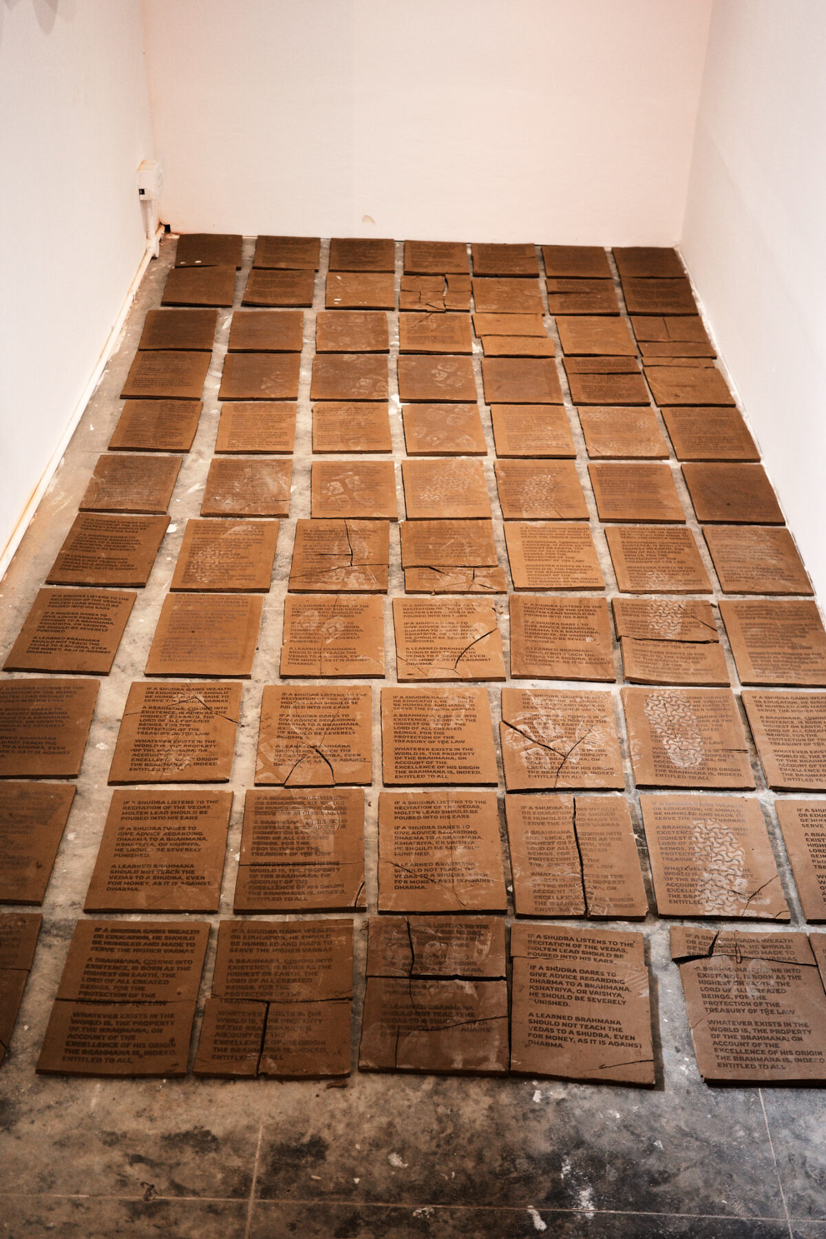 Over time, as people keep stepping, the text becomes less legible. I’m completely okay with that. In fact, I think some of these texts should never be archived. They should not exist. I don’t need to give you evidence of the atrocity; the fact that I had to create them just to destroy them should tell you enough. And this is coming from someone who cares deeply about archives, who loves holding on to pieces of history. The work at Kochi via Conflictorium displays only the walkway tiles on a 6 by 10-foot floor space.