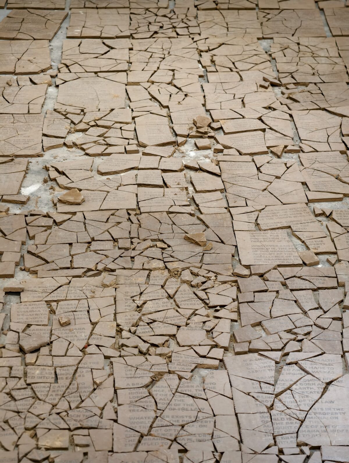 Inspired by this, I wanted to use that same material, water, to destroy the Manusmriti. I started working with unfired clay tiles, roughly A4 or letter size, so they read as “documents.” I went through the Manusmriti and picked verses that specifically talk about education and what should happen if someone from an oppressed caste dares to study, what punishments are prescribed. It was a very painful process to read and select those texts.
